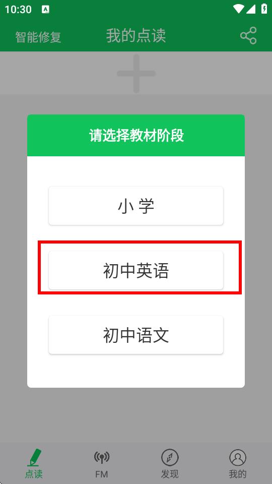 2、在彈出的請選擇教材階段界面中,點擊初中英語選項。