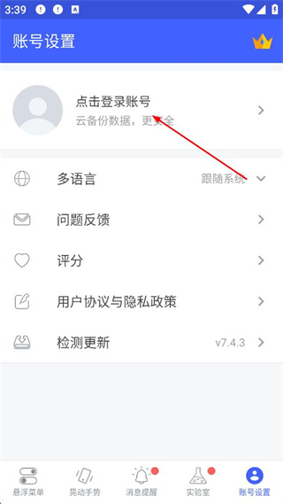 2、進(jìn)入賬號設(shè)置界面后點(diǎn)擊“點(diǎn)擊登錄賬號”。