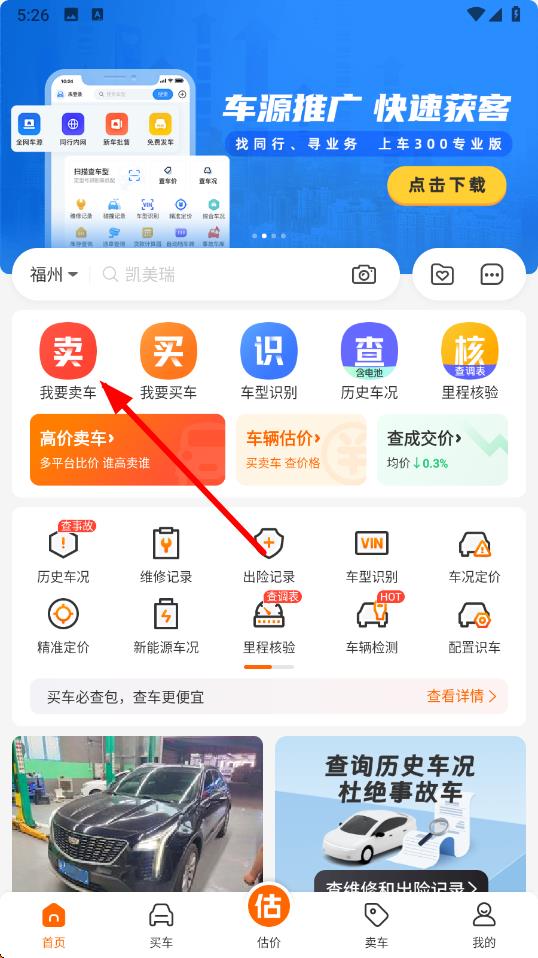 1、打開(kāi)車300app,在首頁(yè)點(diǎn)擊我要賣車選項(xiàng),進(jìn)入賣車信息填寫(xiě)頁(yè)面。