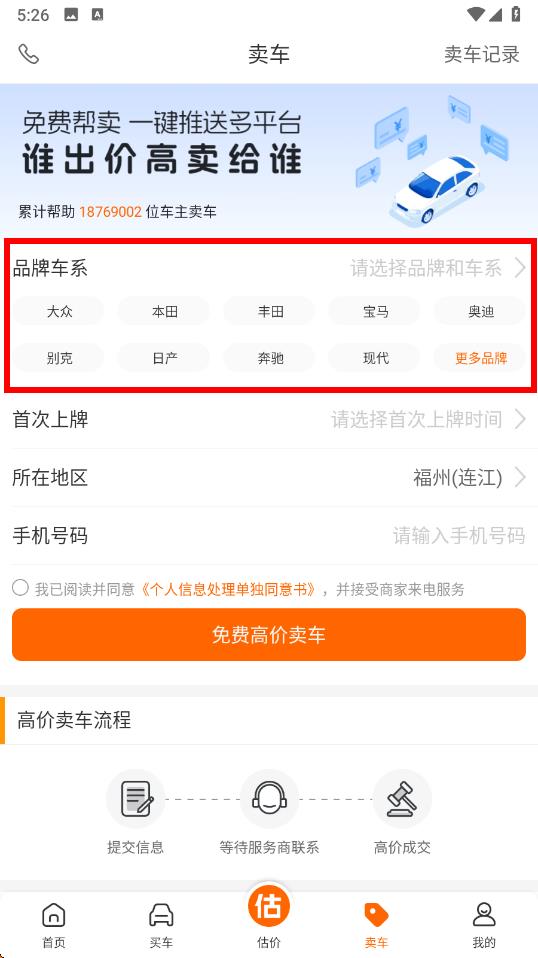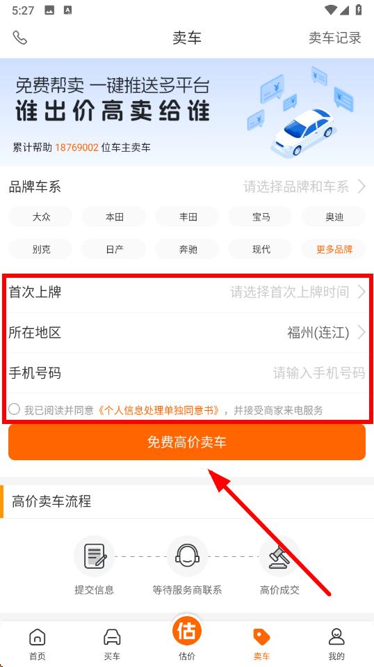 4、接著依次填寫(xiě)首次上牌時(shí)間、所在地區(qū)、手機(jī)號(hào)碼,勾選同意個(gè)人信息處理單獨(dú)同意書(shū),點(diǎn)擊免費(fèi)高價(jià)賣車按鈕,即可發(fā)布賣車信息。