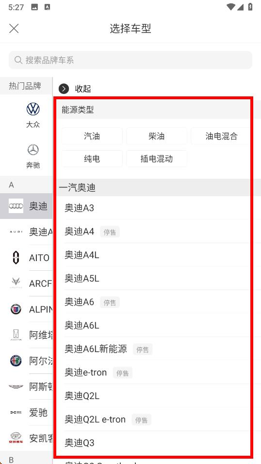 3、選擇好品牌車系后,進(jìn)一步選擇車輛的具體車型以及能源類型。