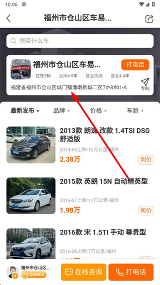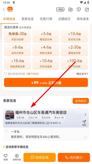 3、在車輛詳情頁(yè)面,找到賣家信息區(qū)域并點(diǎn)擊進(jìn)入。