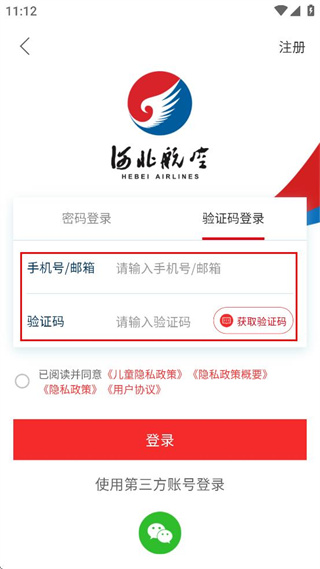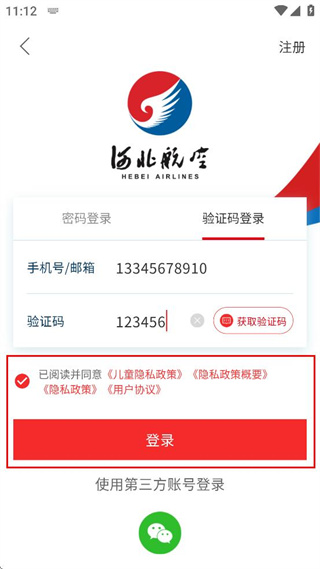 4、填寫(xiě)收到的驗(yàn)證碼,勾選相關(guān)協(xié)議選項(xiàng),點(diǎn)擊登錄按鈕完成河北航空賬戶登錄。