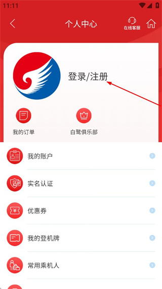 1、打開(kāi)河北航空,點(diǎn)擊頁(yè)面底部的個(gè)人中心選項(xiàng),進(jìn)入對(duì)應(yīng)頁(yè)面,找到登錄/注冊(cè)區(qū)域。