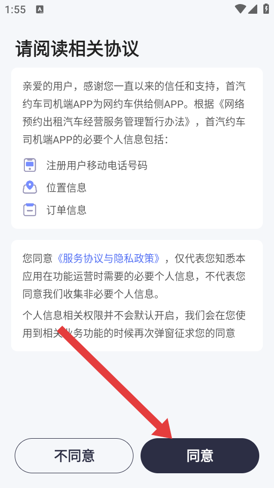 1、進(jìn)入app需要先閱讀協(xié)議內(nèi)容后,點(diǎn)擊同意按鈕,確認(rèn)知悉必要個(gè)人信息收集規(guī)則,進(jìn)入下一步。