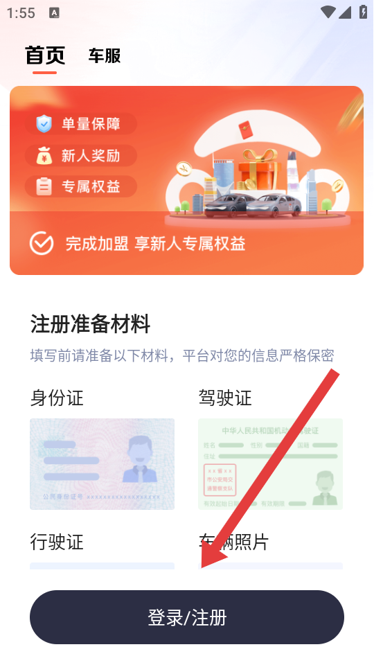 2、需要準(zhǔn)備身份證、駕駛證、行駛證、車輛照片這些材料,點(diǎn)擊登錄/注冊(cè),提交注冊(cè)的申請(qǐng)。