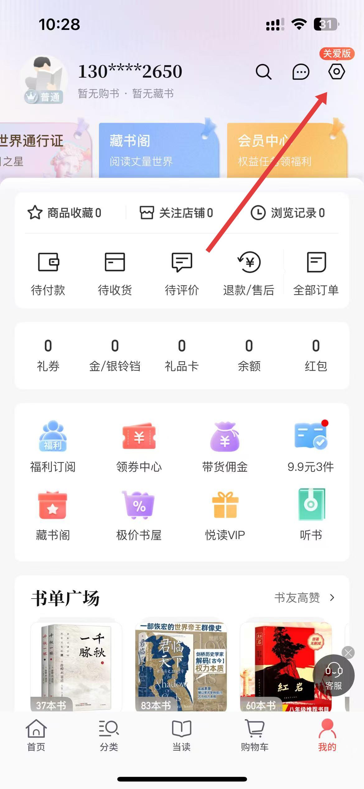 1、打開當當網APP并登錄,點擊底部導航欄的我的選項,進入個人頁面,在該頁面右上角找到設置圖標并點擊。