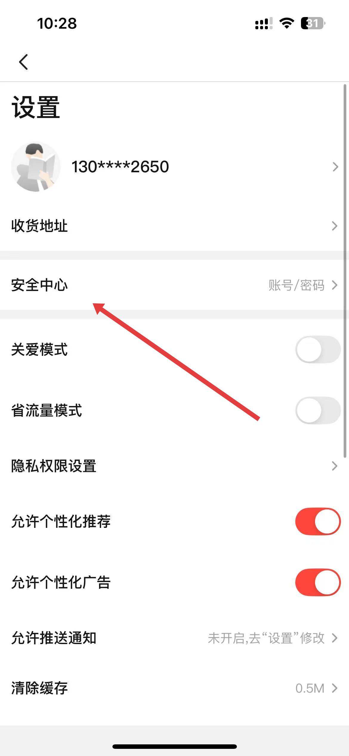 2、進入設置頁面后,找到并點擊安全中心,進入賬號安全頁面。