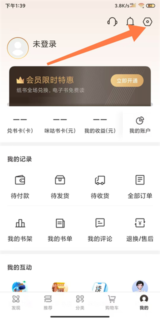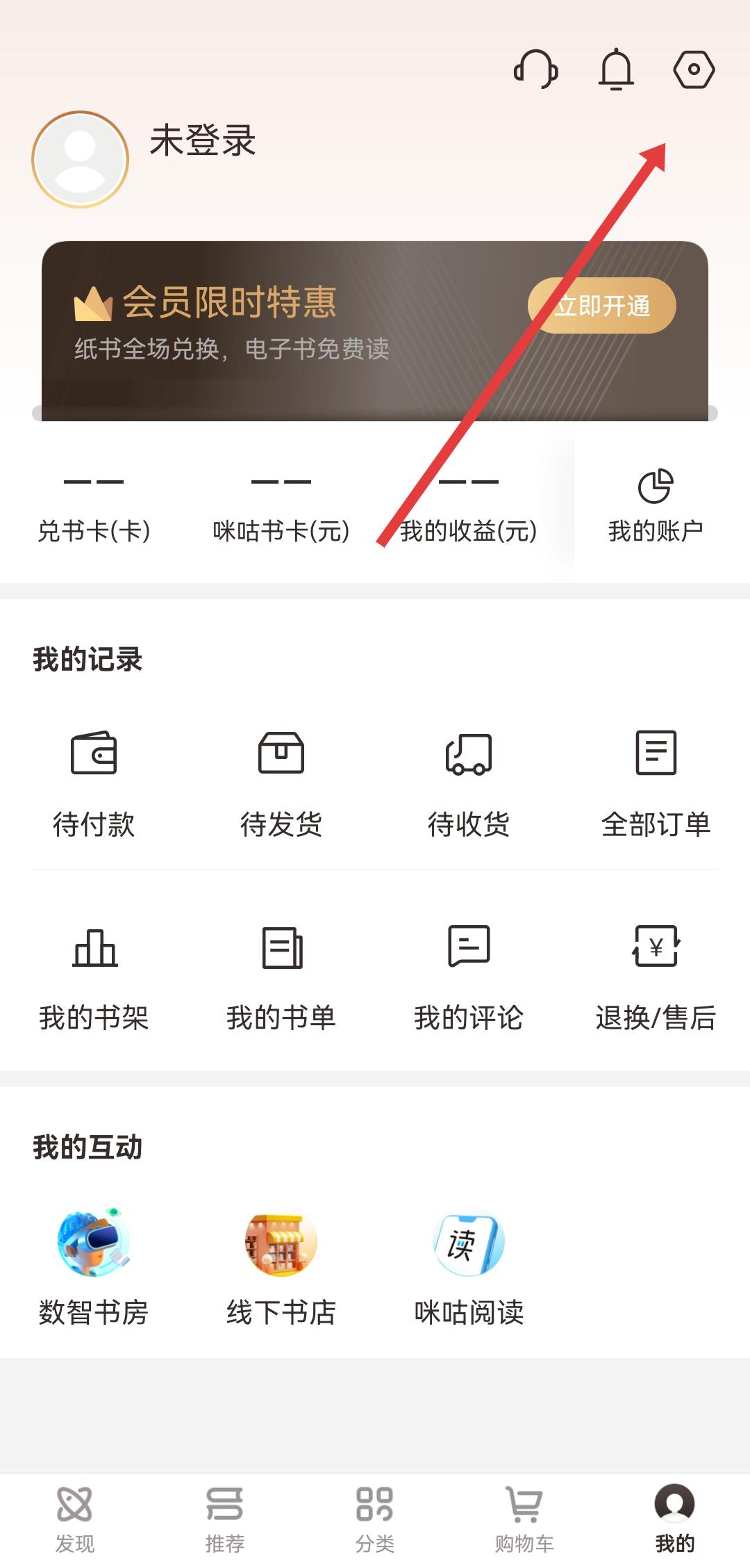 1、打開(kāi)咪咕云書(shū)店APP,點(diǎn)擊進(jìn)入我的頁(yè)面,找到右上角的設(shè)置圖標(biāo)并點(diǎn)擊,進(jìn)入設(shè)置界面。