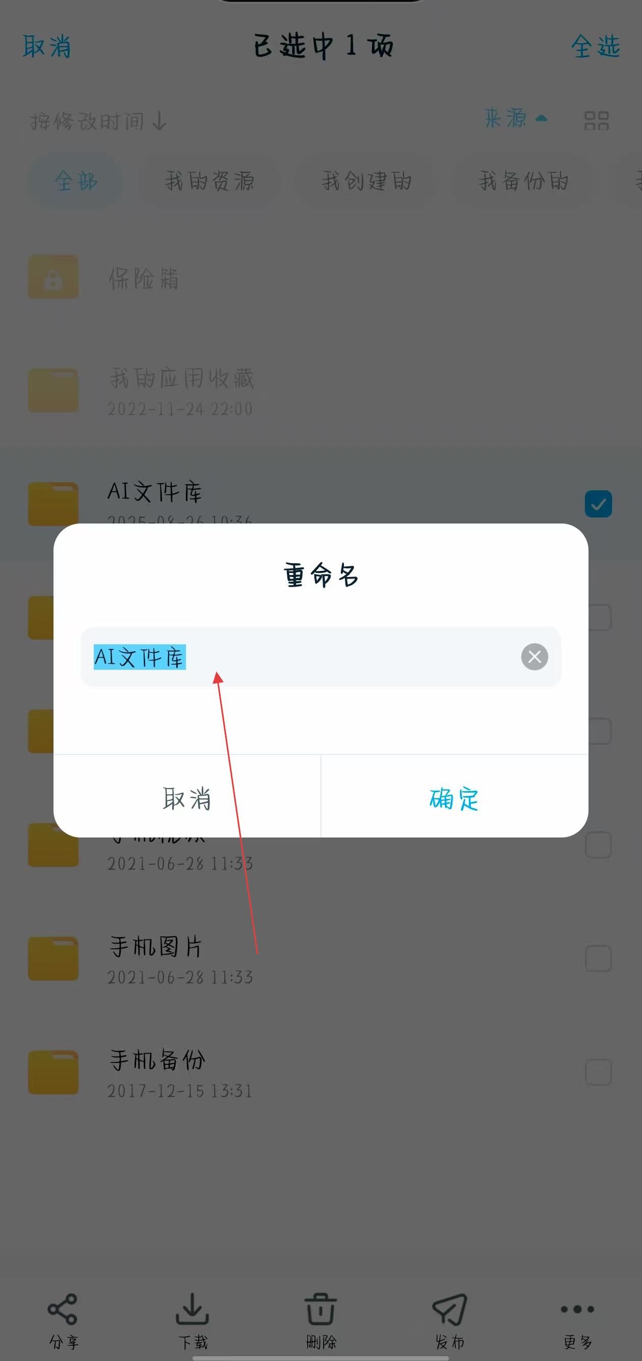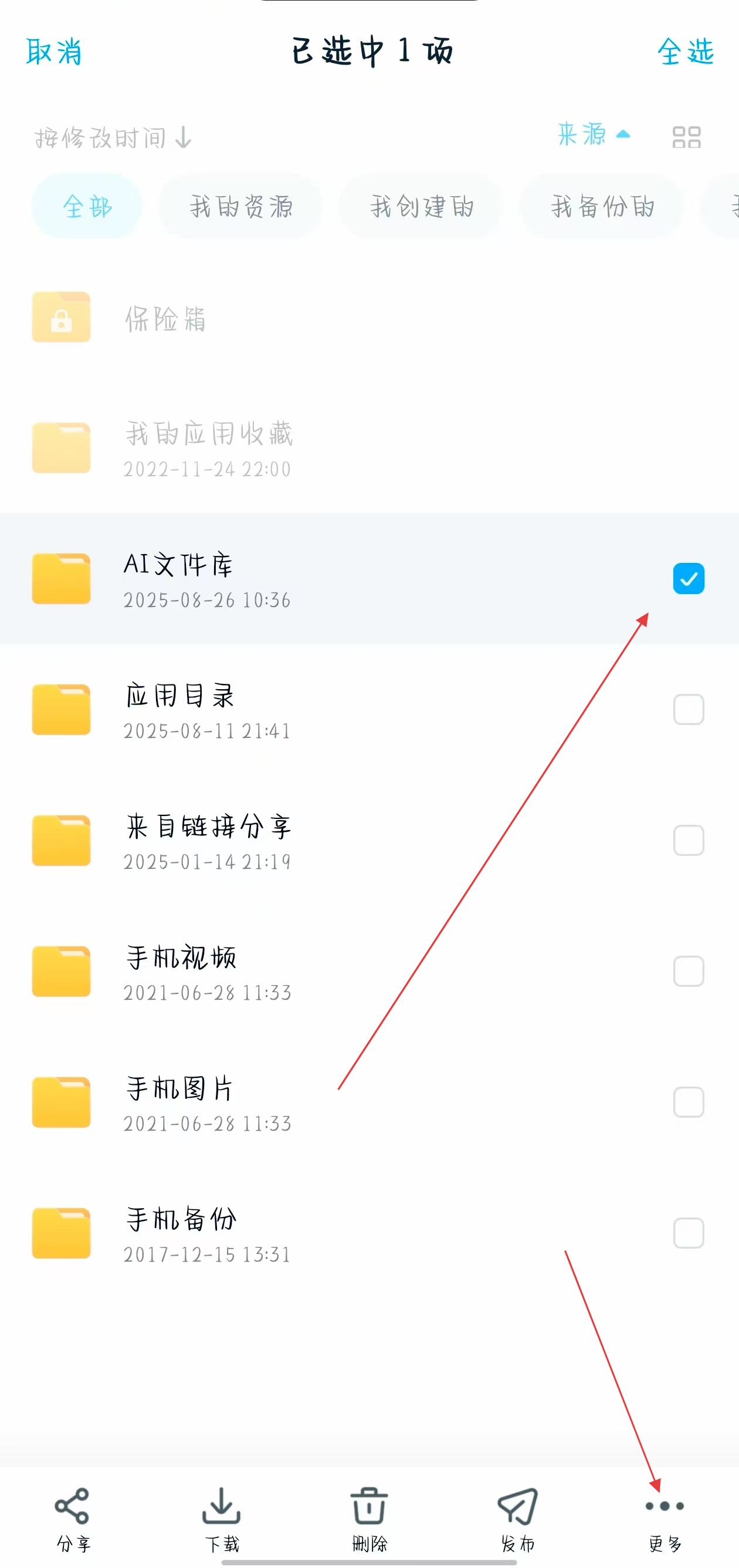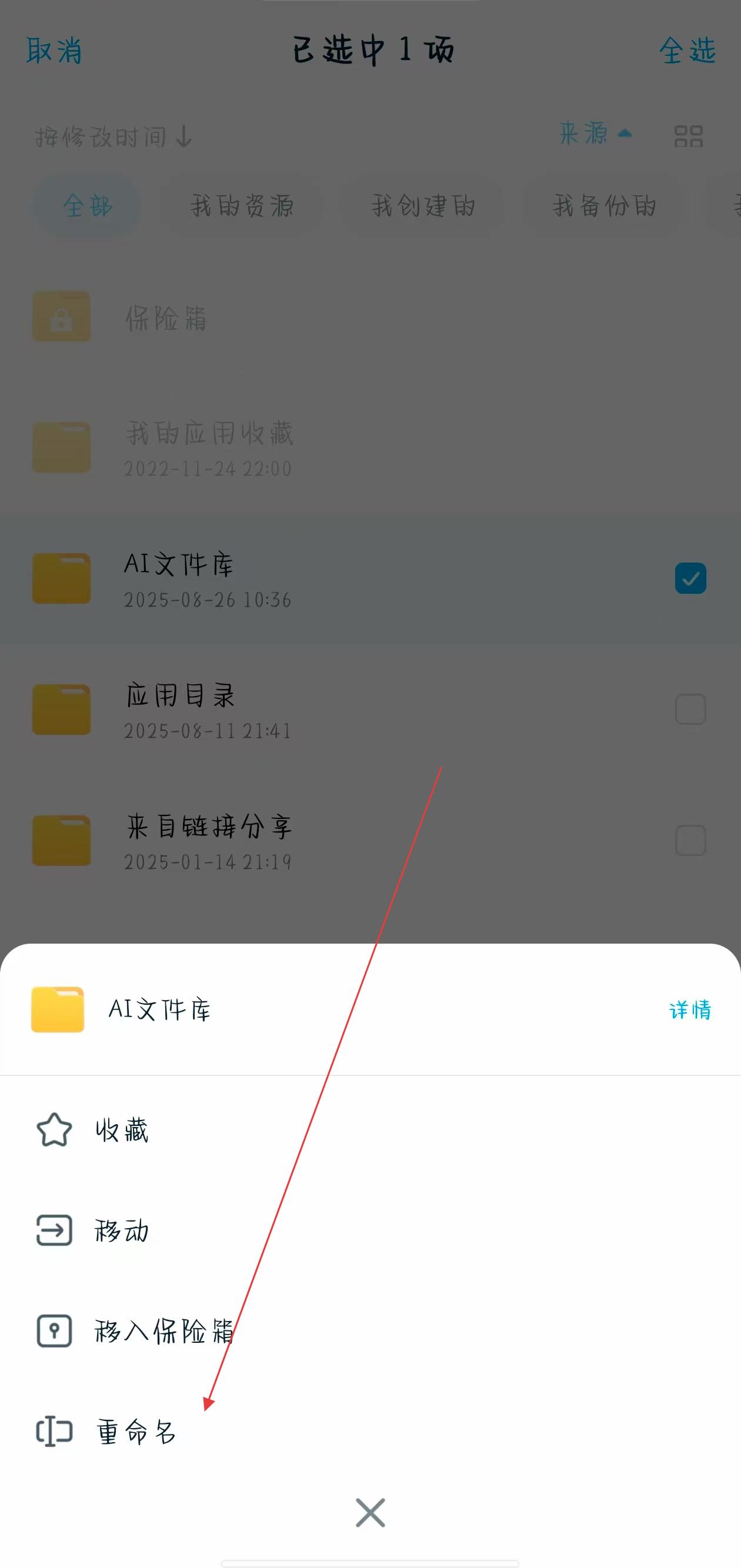 1、打開(kāi)中國(guó)移動(dòng)云盤(pán)應(yīng)用,進(jìn)入文件資源列表界面,長(zhǎng)按需要修改文件名的文件或文件夾,如AI文件庫(kù),點(diǎn)擊其右側(cè)的勾選框?qū)⑵溥x中。