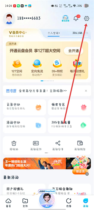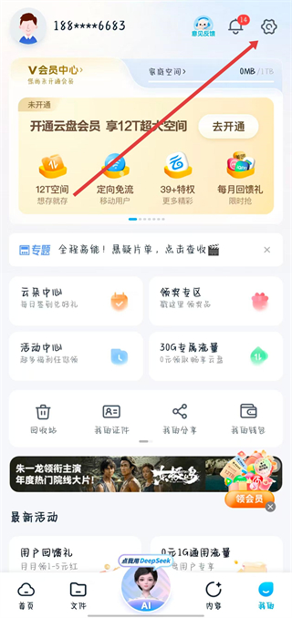 1、打開(kāi)中國(guó)移動(dòng)云盤(pán)應(yīng)用,進(jìn)入個(gè)人中心頁(yè)面,點(diǎn)擊右上角設(shè)置圖標(biāo)。
