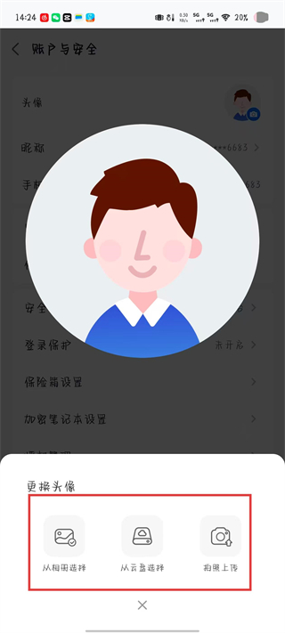 4、在更換頭像的選項(xiàng)中,選擇從相冊(cè)選擇從云盤(pán)選擇或拍照上傳的方式。