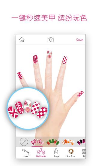 你可以立即拍攝或使用內(nèi)建手模照片來進(jìn)行設(shè)計(jì),并透過膚色來個(gè)人化你的美甲照片