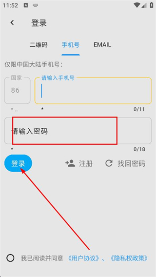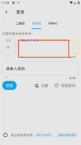 3、在登錄頁(yè)面選擇手機(jī)號(hào)標(biāo)簽,輸入對(duì)應(yīng)的手機(jī)號(hào)碼。