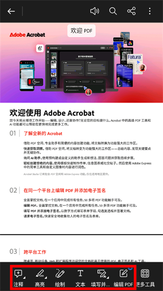 4、在文件閱讀界面,點(diǎn)擊下方工具欄,選擇注釋、高亮、編輯PDF等工具,即可使用對(duì)應(yīng)功能。