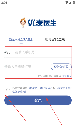 1、打開優(yōu)麥醫(yī)生APP,輸入手機(jī)號并輸入驗證碼,勾選后點擊登錄。