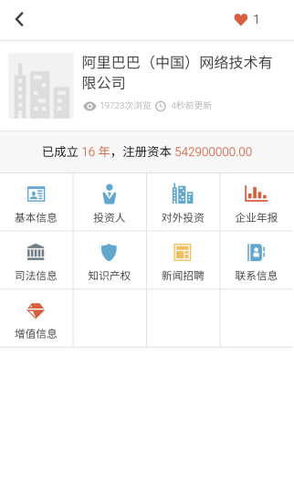 信息緯度全面,包括企業(yè)工商登記信息(企業(yè)名稱、注冊時間及資本、法人代表、股東及高管)、年報、投資人、對外投資、涉訴、失信、商標、專利、變更記錄、新聞報道、招聘等信息。