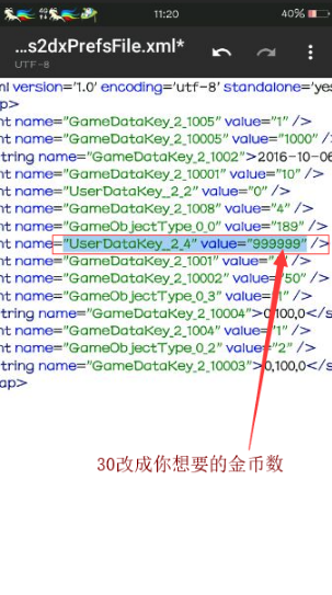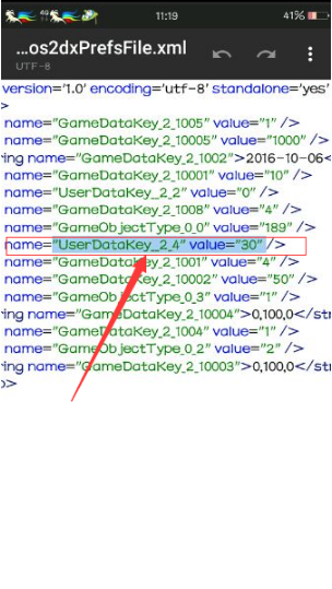 5.打開Cocos2dxPrefsFile.xml ,標示的那一行意思就是用戶的金幣價值是多少,我們之前的是30
