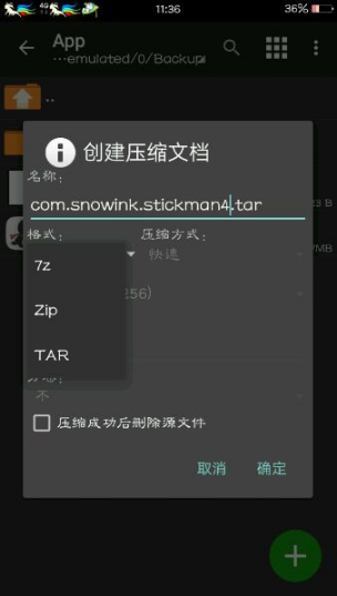6.打開zarchiver,把原來的tar格式的壓縮包重命名,復制一下他的名稱,之后就可以刪掉了,再長按修改后的data文件,選擇壓縮...格式仍然是tar 。
