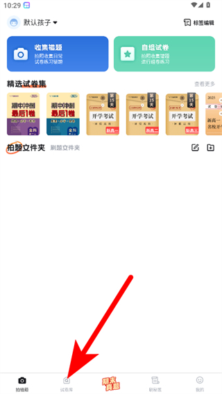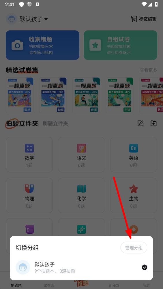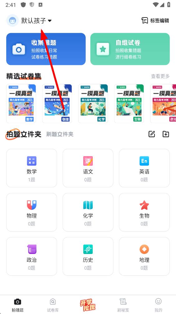 1、打開考霸錯題本app,點擊首頁左上角的默認孩子選項。