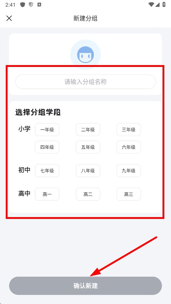 4、在新建分組界面,輸入分組名稱,并選擇分組學段,確認信息無誤后,點擊確認新建按鈕,即可成功新建分組。