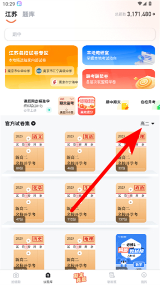 2、在題庫頁面,點擊年級篩選按鈕,如高二,彈出試卷集年級篩選框。