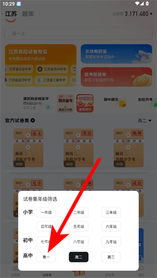 3、在試卷集年級篩選框中,選擇要更換的年級,如高一。