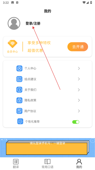 2、進入個人頁面,找到登錄/注冊選項并點擊。