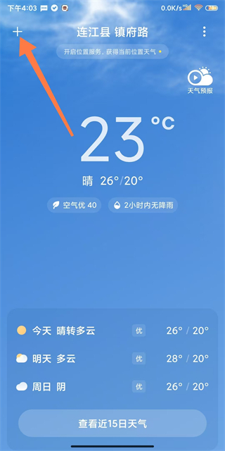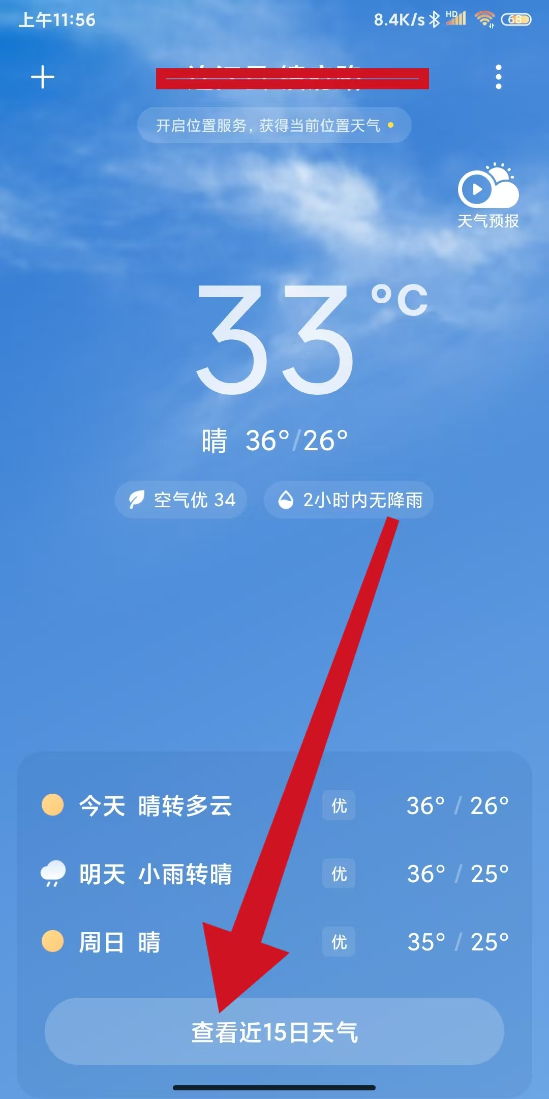 3、回到天氣app主界面,找到并點擊查看近15日天氣按鈕。