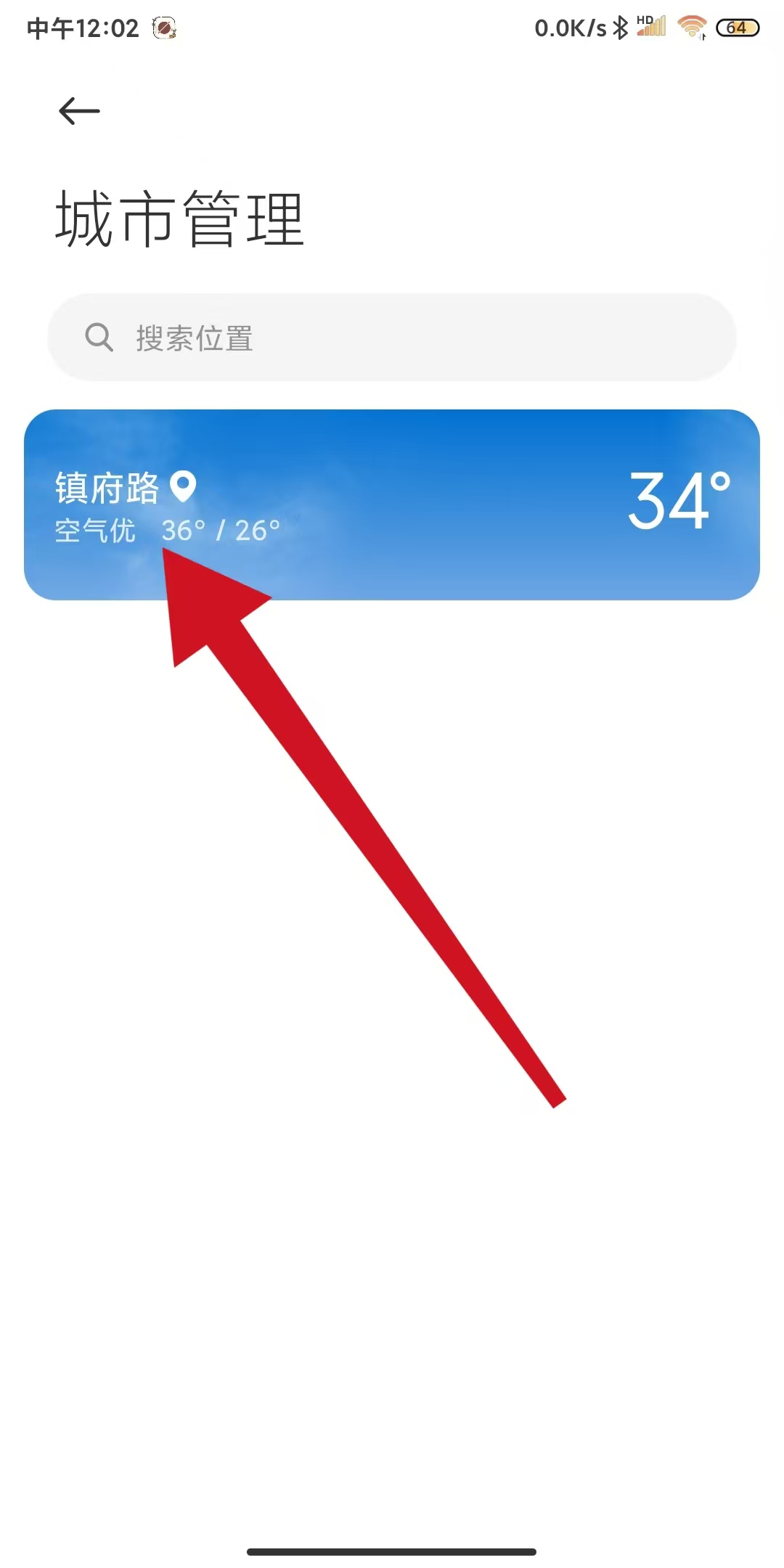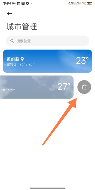 2、在城市管理頁面,找到要刪除的其他城市,往左滑動。