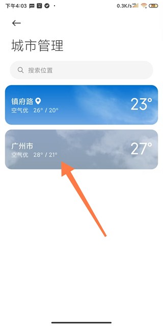 2、進入app后點擊界面右上角的定位標(biāo)識,進入城市管理界面,選擇或搜索想要查看天氣的城市。