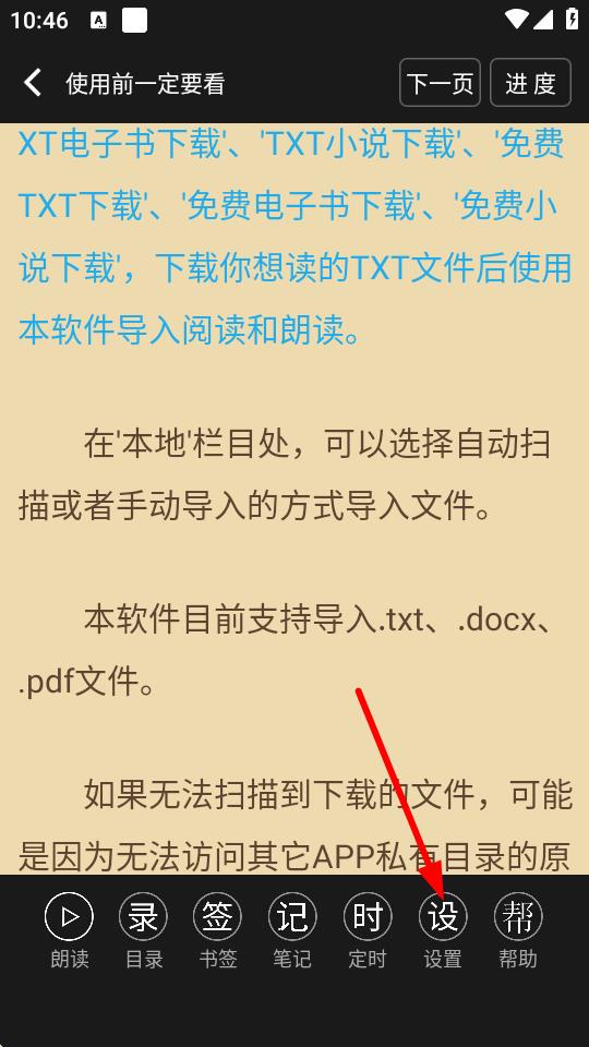 3、在文檔閱讀界面,點擊屏幕調(diào)出功能欄,然后點擊設(shè)置選項。