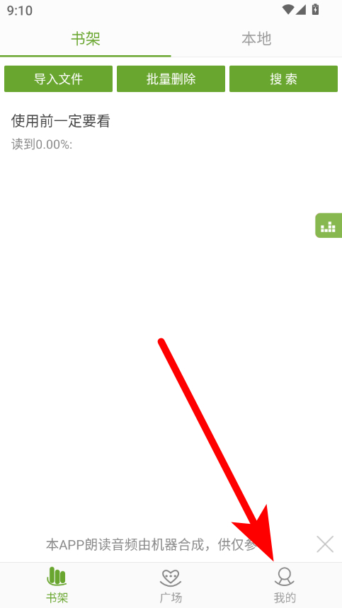 1、在txt文本聽書書架頁面,點擊右下角我的選項,進入個人界面。