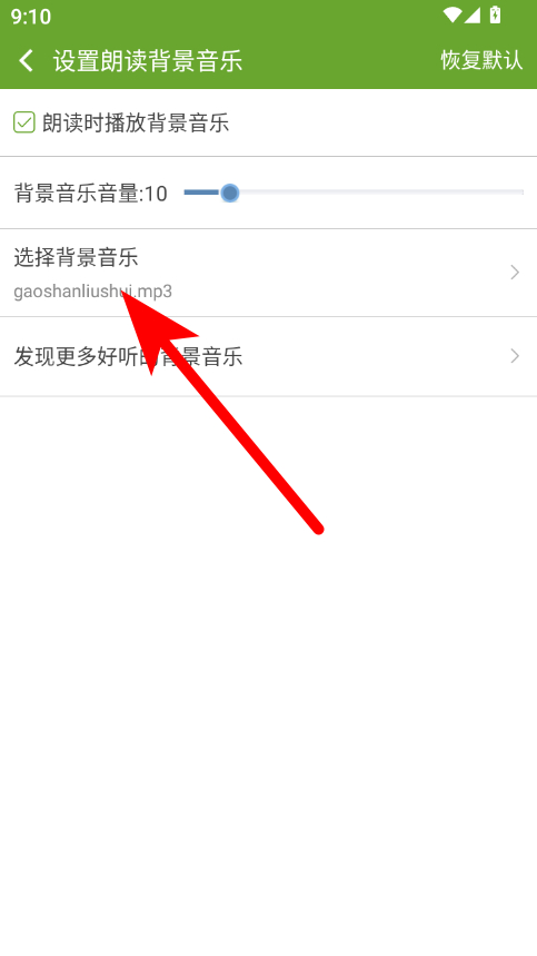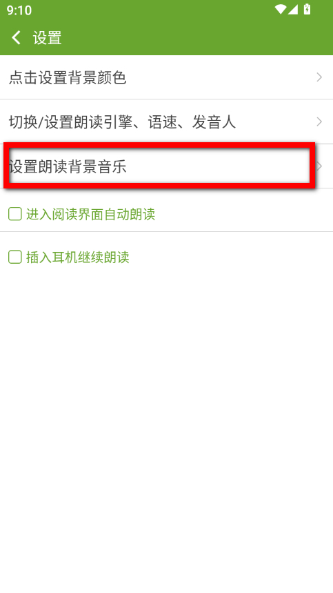 3、在設(shè)置頁面,點擊設(shè)置朗讀背景音樂選項,進入音樂設(shè)置界面。