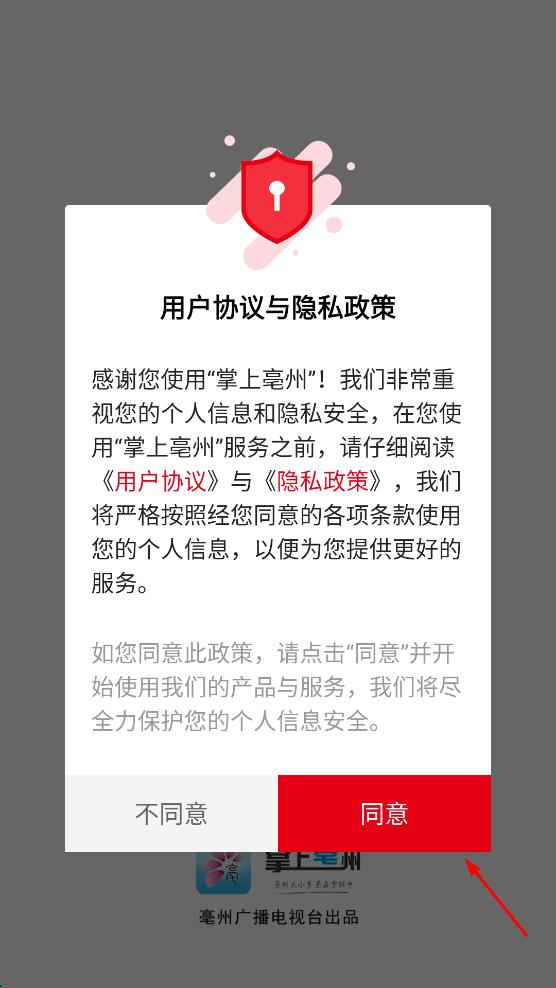 1、打開掌上亳州App,在用戶協(xié)議與隱私政策頁面,點擊“同意”按鈕。