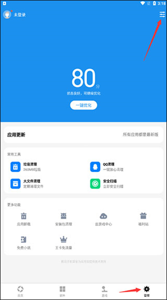 1.首先我們點(diǎn)擊應(yīng)用包軟件進(jìn)入軟件主頁面,點(diǎn)擊最下方的【管理】按鈕,進(jìn)入管理頁面后,點(diǎn)擊右上角的菜單標(biāo)志,如下方箭頭所示;