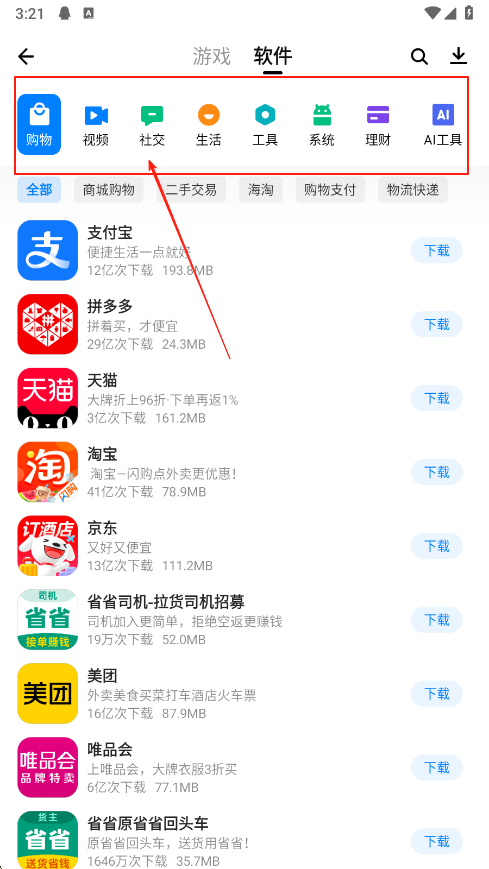 1、打開應(yīng)用商店,進(jìn)入軟件板塊,可看到購物,視頻,社交等分類,根據(jù)需求選擇分類,瀏覽對(duì)應(yīng)類別的軟件,找到想要的軟件后,點(diǎn)擊下載即可。