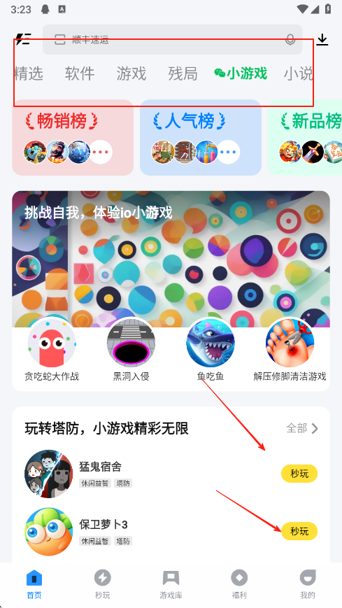 2、切換到小游戲板塊,能看到暢銷榜,人氣榜,新品榜等榜單,還有各類小游戲推薦,看到喜歡的小游戲如猛鬼宿舍,保衛(wèi)蘿卜3,點(diǎn)擊秒玩,可快速體驗(yàn)游戲。