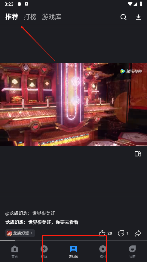3、進(jìn)入游戲庫板塊,可查看推薦、打榜等分類下的游戲內(nèi)容,瀏覽游戲相關(guān)展示,若對(duì)某款游戲感興趣,可進(jìn)一步了解游戲詳情,也能根據(jù)需要進(jìn)行下載等操作。