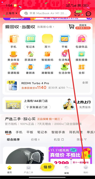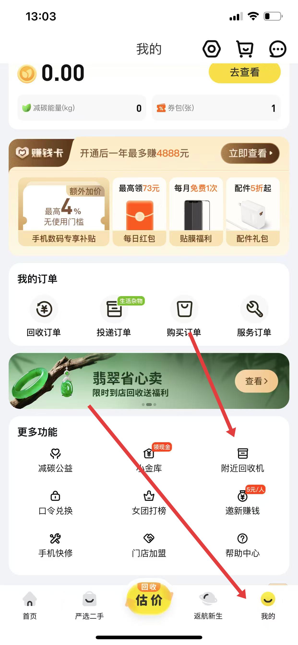1、打開愛回收App,點擊下方導(dǎo)航欄中我的,在更多功能板塊,找到并點擊附近回收機。