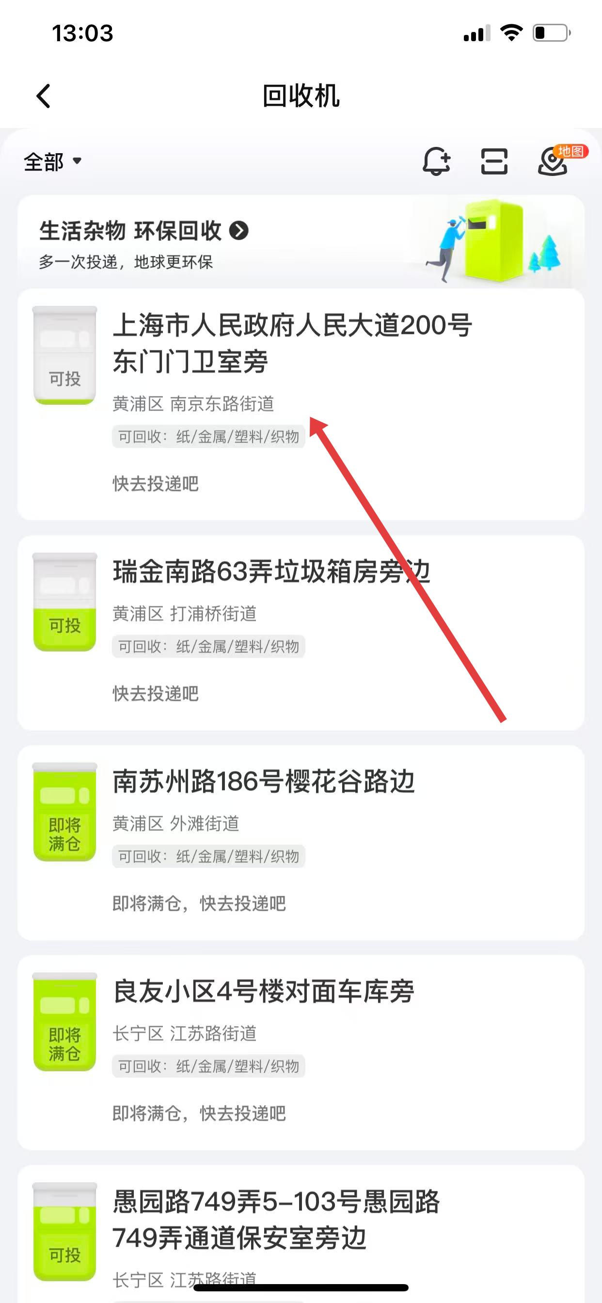 2、進入回收機頁面后,查看各回收機的狀態(tài),若顯示可投,則代表該回收機當(dāng)前可以投遞,點擊想去投遞的回收機地址。