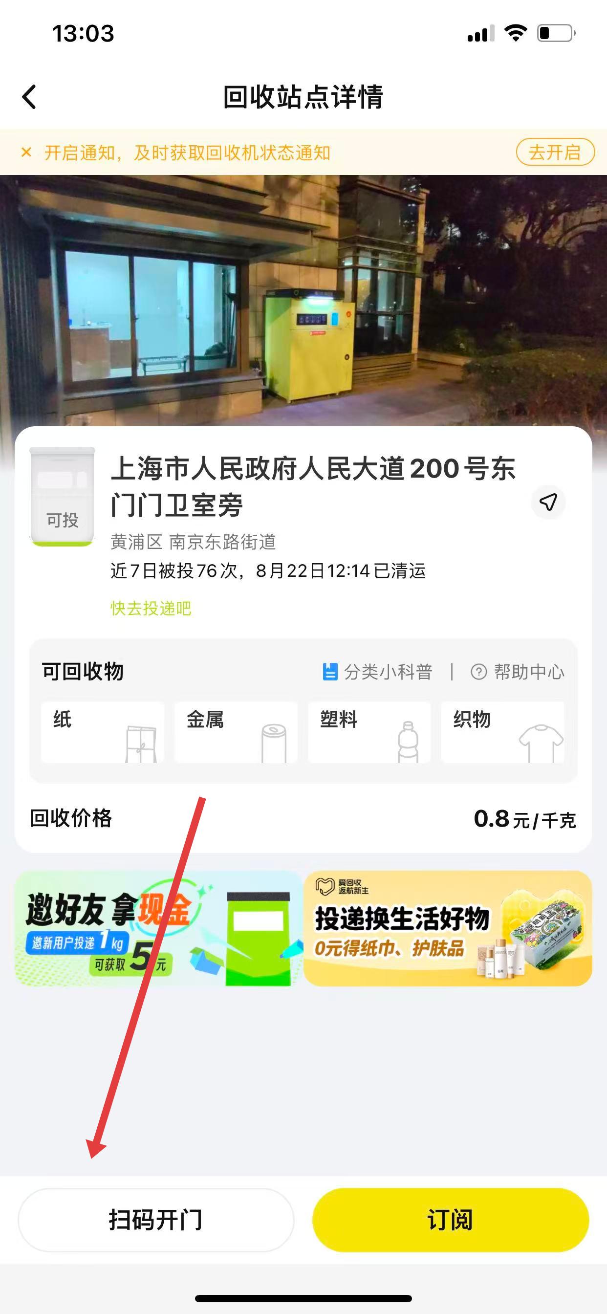 3、在回收站點詳情頁面,確認(rèn)回收機可回收的物品類別,點擊掃碼開門,即可進行投遞。