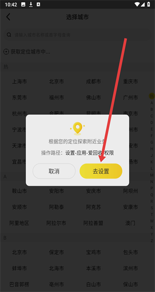 3、在進入到城市設(shè)置頁面中,需點擊彈窗中點擊去設(shè)置按鈕,開啟位置權(quán)限后操作。