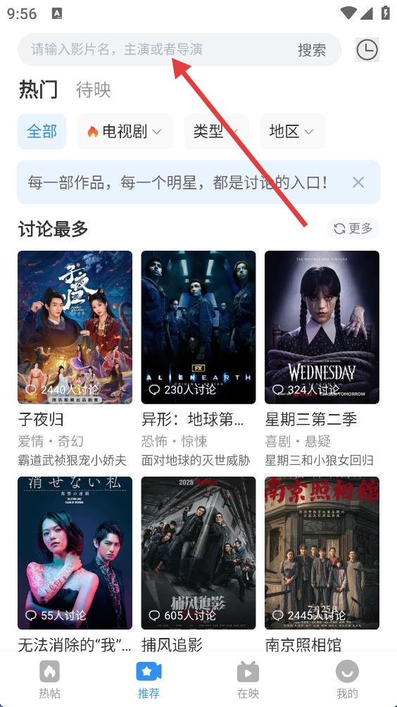 1、打開(kāi)影視大全APP,點(diǎn)擊主界面上方搜索欄,輸入想看的電視劇名稱,點(diǎn)擊搜索按鈕。