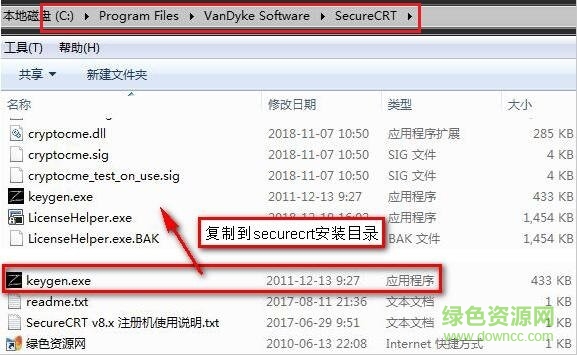 1.打開(kāi)安裝包中的“8.x 注冊(cè)機(jī)”文件夾,將“keygen.exe”復(fù)制到securecrt安裝目錄(默認(rèn)路徑為:C:\Program Files\VanDyke Software\SecureCRT)