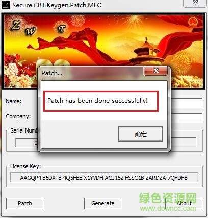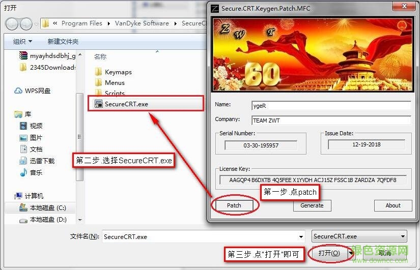 3.然后點(diǎn)擊“patch”,選擇“SecureCRT.exe”可執(zhí)行文件,點(diǎn)擊“打開(kāi)”,會(huì)有“patch has been done successfully!”的提示(按下圖進(jìn)行操作)
