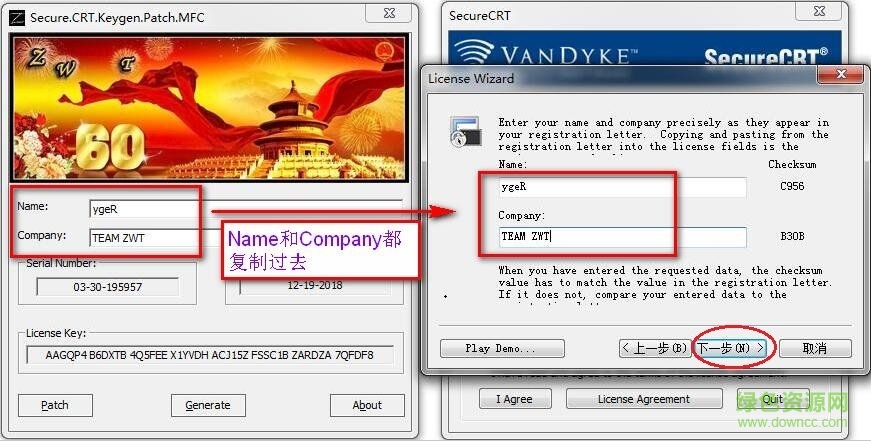 8.然后將注冊(cè)機(jī)中的Name和Company信息都復(fù)制到軟件框中(如圖),再點(diǎn)“下一步”