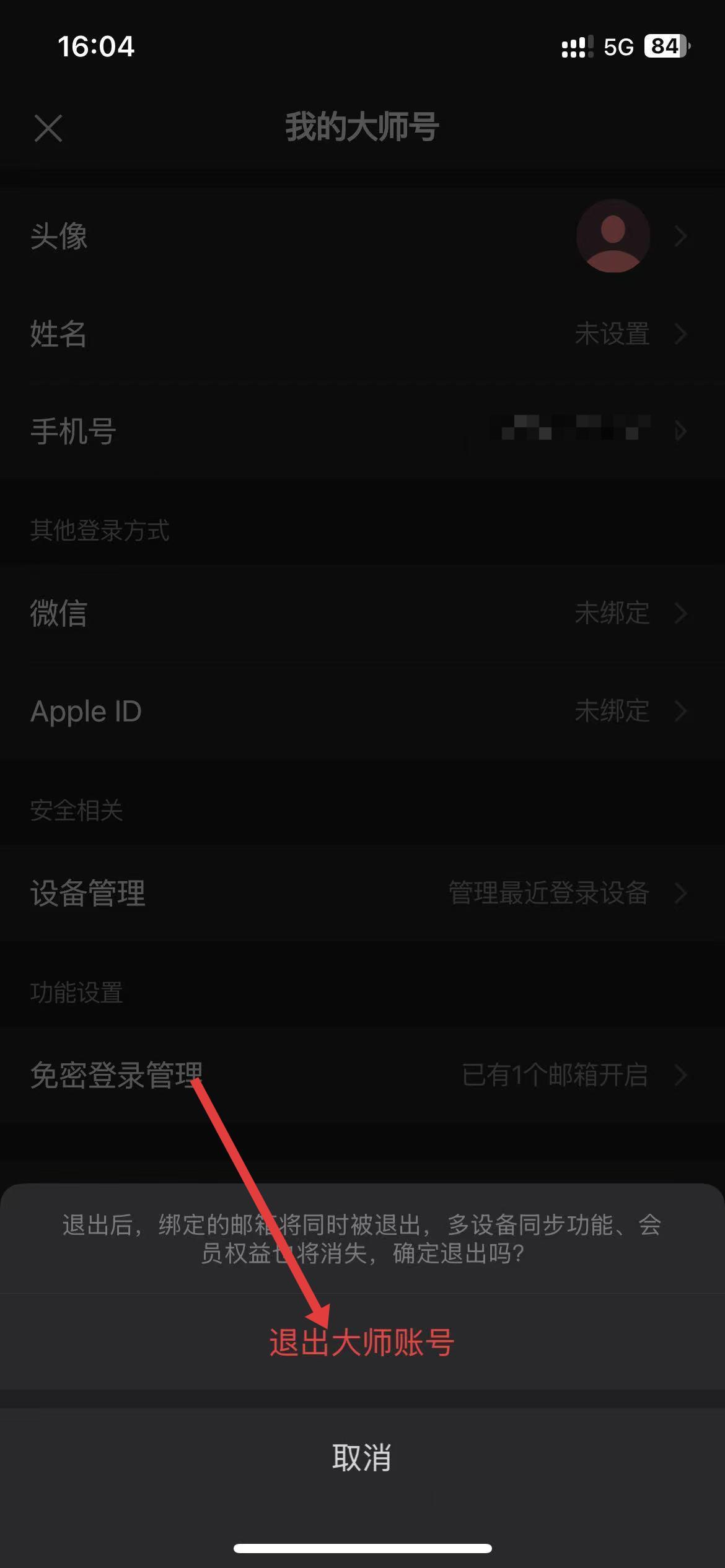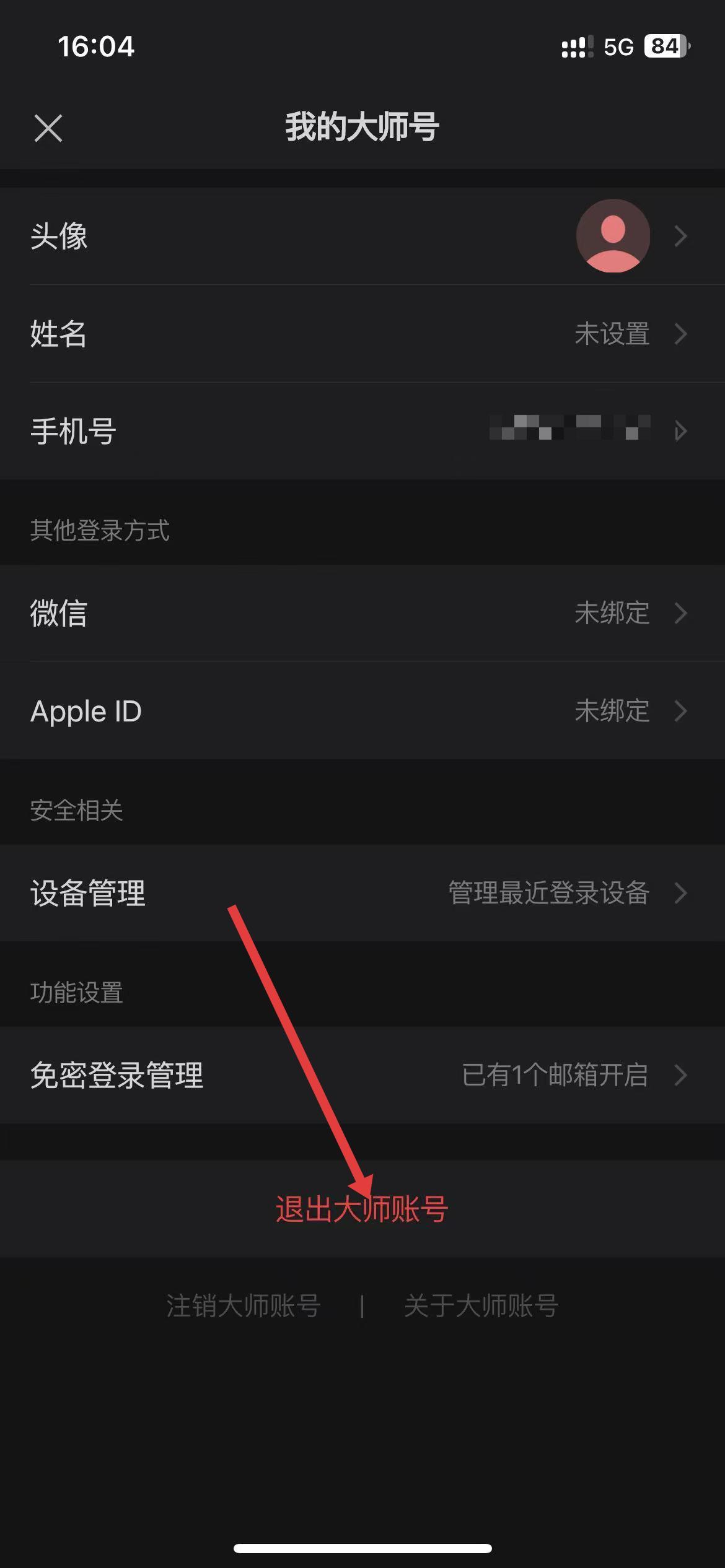3、在我的大師號頁面滑到底部,點擊退出大師賬號。