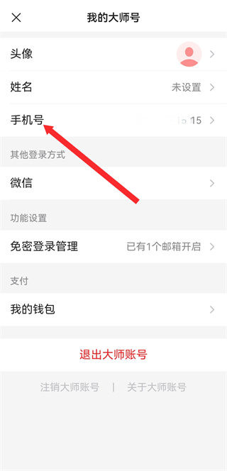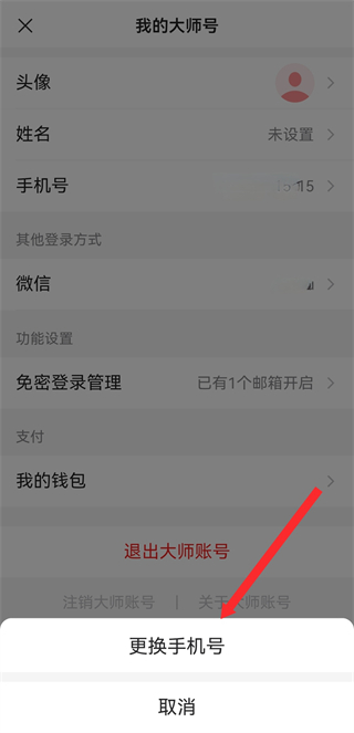 3、在我的大師號的頁面,需要點擊手機號,彈出系統(tǒng)操作的選項。
