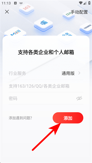 3、在頁面選擇郵箱類型,輸入郵箱賬號和密碼,點擊添加完成郵箱添加。